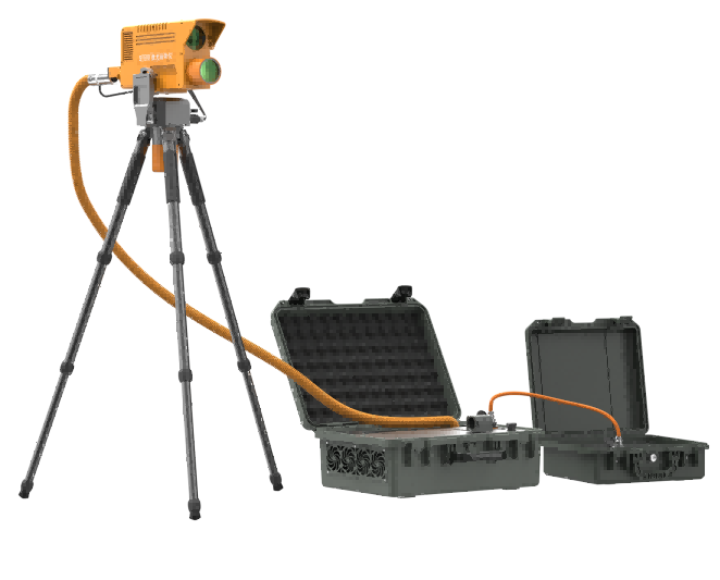 光學(xué)破拆裝置內(nèi)置高能光纖激光器,能夠從地面發(fā)射激光對鋼板、鋁板、鋼筋、彩鋼瓦、樹木、塑料、馬蜂窩等進(jìn)行遠(yuǎn)距離切割清除。