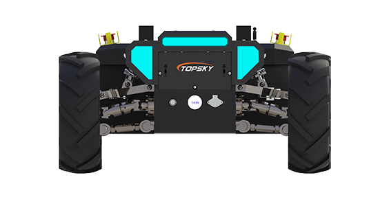 差速輪式機器人底盤采用鋰電池電源作為機器人動力源,使用無線遙控的方式遠距離操控機器人,并可定制復雜的操作模式,主控提供串口/標準CAN總線作為通訊接口。整機采用四輪獨立驅動、四輪差速轉向以及前后雙橫臂獨立懸架結構,具有IP65防塵防水能力,能夠在多種復雜環(huán)境運行。同時,整機采用模塊化設計,四獨立懸掛、左右電控箱及電池可快速拆卸維護更換。可搭載多種設備從而代替人進行高效率作業(yè)。