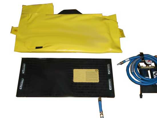 2種規(guī)格(旋轉(zhuǎn)扣型,重量25kg,帶子導向扣型,重量16.9kg),密封面積50×30厘米,軟橡膠材質(zhì),配有快速充泄氣切換接口,1個帶安全壓力表的腳踏高壓氣泵。適用于在地形復雜的狹窄空間內(nèi)密封直徑在5至48厘米的管道及圓形容器的裂縫。