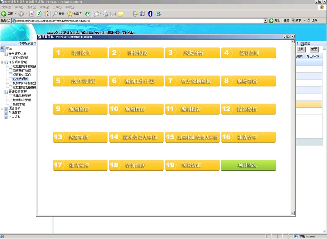 按照安評過程控制標準,結合安全評價機構的日常工作流程,對安全評價整個過程進行網(wǎng)絡化地控制和監(jiān)管,根據(jù)風險分析、實施評價、報告審核、技術支撐、作業(yè)文件、內(nèi)部管理、檔案管理和檢查改進八要素對所有評價項目過程進行嚴格把關,要求安全評價機構將現(xiàn)有項目的進度情況及時上報到系統(tǒng)中,規(guī)范安全評價機構工作流程,實現(xiàn)安全評價過程控制的信息化,在方便安全評價機構內(nèi)部管理的同時有利于監(jiān)管部門對安全評價機構的評價行為進行實時動態(tài)的監(jiān)督管理。