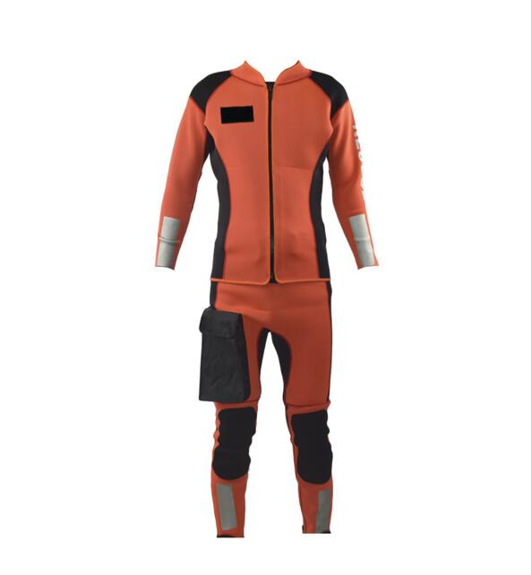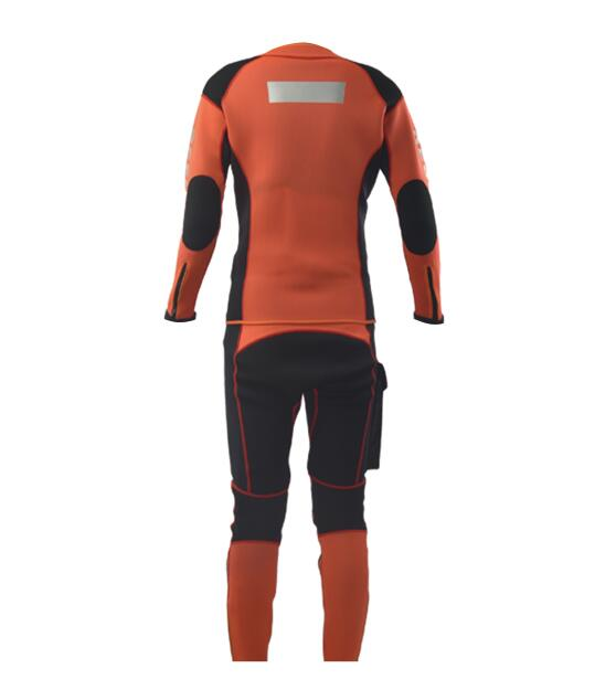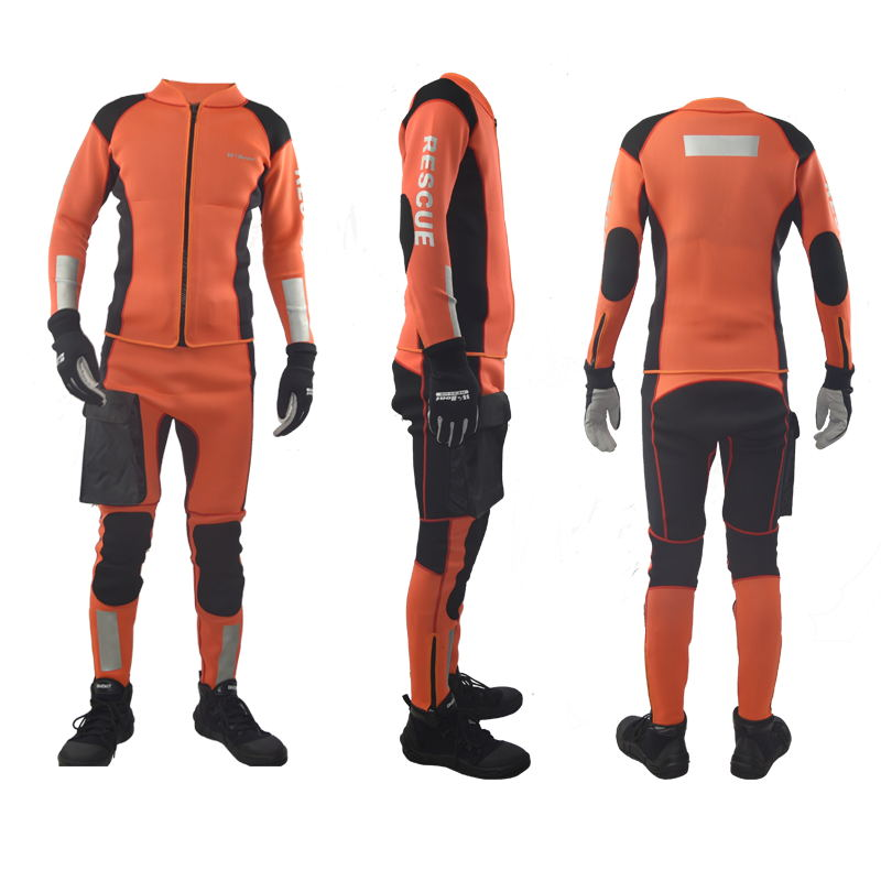 水域救援專用分體式濕式服,前開拉鏈長袖上衣和中腰褲兩件套。3mm高彈氯丁橡膠面料制作,相拼3mm超彈氯丁橡膠面料,有效的提升運動的自由度。無極調節(jié)尼龍戰(zhàn)術腰帶和高強度塑鋼插扣,防止衣服滑落。右腿外側設有一個防水尼龍面料立體口袋,臀部一片式、護膝、護肘易摩擦部位,均采用彈性聚酯纖維復合面料,增加救援服的耐磨性。衣袖、褲口及背后都設有彈性反光帶。領口、袖口及褲口處YKK拉鏈開合。